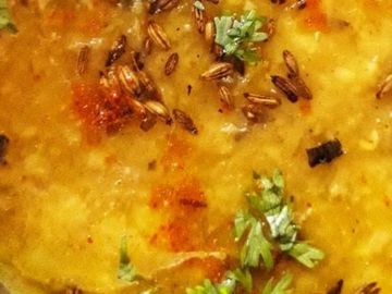 Yellow dal fry, tempered with cumin, onions, tomatoes, garlic, ghee