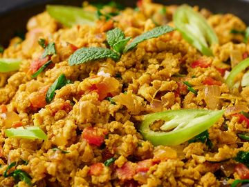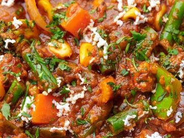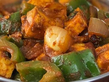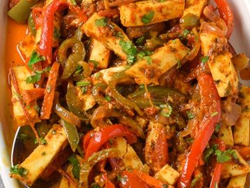 Paneer cooked in a kadhai gravy of tomatoes, peppers and onions.