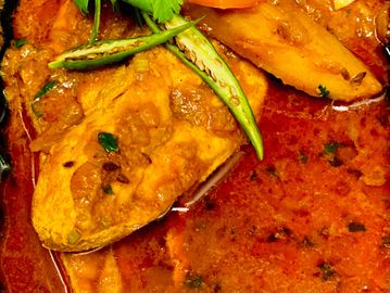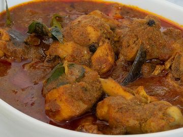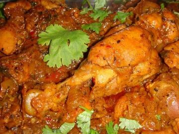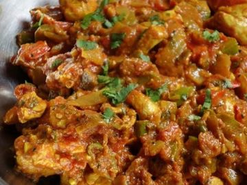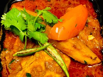 Chicken in a thick gravy of whole spices, peppers, onions and tomatoes, bone-in or boneless