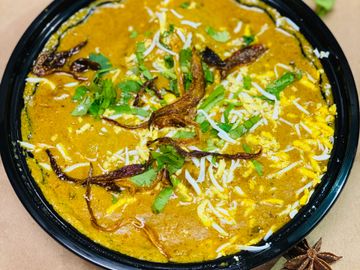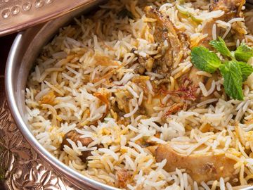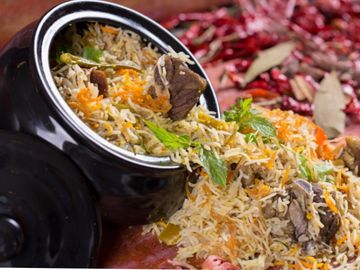 Succulent mutton and long grained Basmati rice cooked in ghee with flavors of saffron, garam masala and fried onions