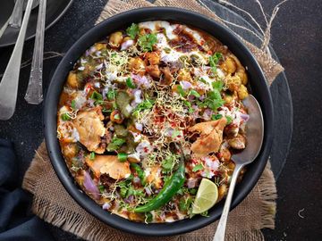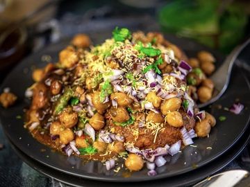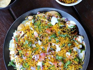 Delhi style Papdi (crisp wafers) with potatoes, yogurt, mint and tamarind chutneys