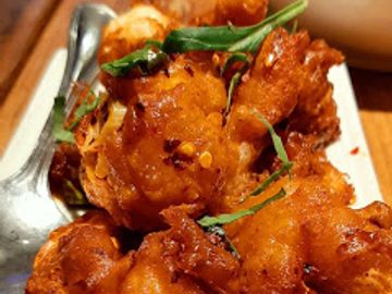 Cauliflower fritters, cilantro, onions, scallion, ginger, house sauce
